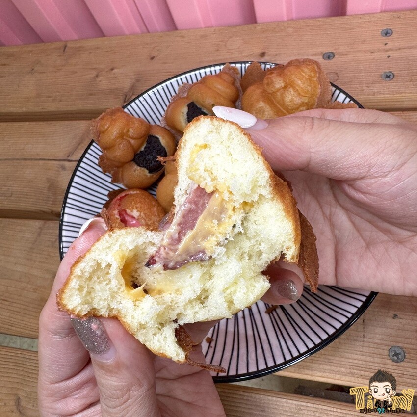 雞蛋糕有兩種不同造型,雞蛋造型有原味熱狗、香濃起司、白巧克力等口味,便便造型有經典原味和OREO。