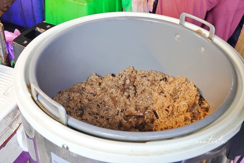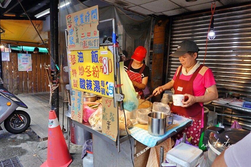 除了油飯、酸辣湯、四神湯外,還有賣炒冬粉,油飯是以斤來算,一斤大概兩三個人吃差不多,來買的客人都是包一大包帶走,酸辣湯也是可以用袋裝包一大碗,價格非常實惠,一斤油飯80元,可買半斤;酸辣湯一碗也才35元,配料豐富,光喝湯就飽了。