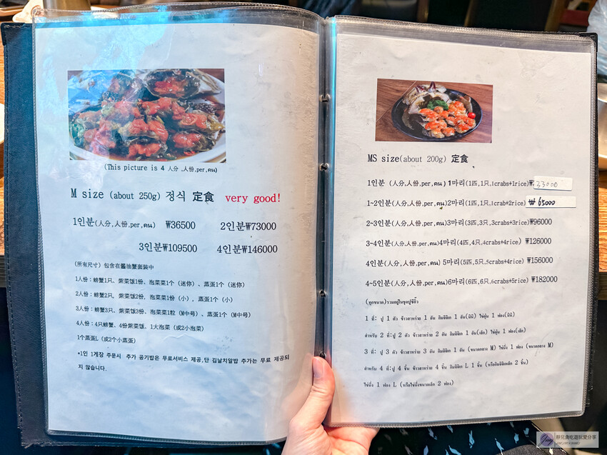 菜單部分也有中文,所以還算好辨認,有些店員也會說中文,不知道怎麼點可以依人數選擇大中小套餐,除了醬蟹套餐外,額外也有醬蝦、生拌牛肉、酒精飲品等等,套餐價位落在39800~182000韓元,大概一千~四千台幣左右