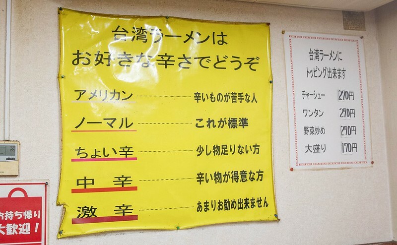 說來台灣沒有的「台湾ラーメン」(別再說台灣人愛無中生有如泰國月亮蝦餅、如溫州大餛飩),名古屋普遍的說法是50年前「台灣拉麵 味仙」創始的,大概就是把台灣擔擔麵上的肉燥加辣,然後和日本拉麵結合,一般來說可以分辣度的,但在台湾ラーメン 光陽更細分為5級,比較有趣的是第一級叫「アメリカン」(美國風),是說美國人不吃辣嗎?