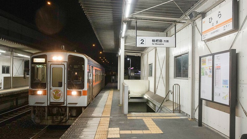 比良站(ひら)屬對向式月台2面2線的高架無人車站,來回兩次碰到的人沒超過5個...查了一下每天從這上車的人數是114,顯然不是一個重點、熱鬧的車站。而這也是我喜歡追孤獨的美食家的餐廳樂趣之一,因為可以去很多不知道的小町、小地方。即便在大城市,都可以看到不同的旅遊風情,即便如五郎在八高線小宮站下車時說的「何もない」。是說,從那時候開始,我就愛上這種「何もない」的離群旅行...謝謝五郎帶我去很多何もない的地方。哦,比良站周邊其實也差不多,除了遠處的燈火。