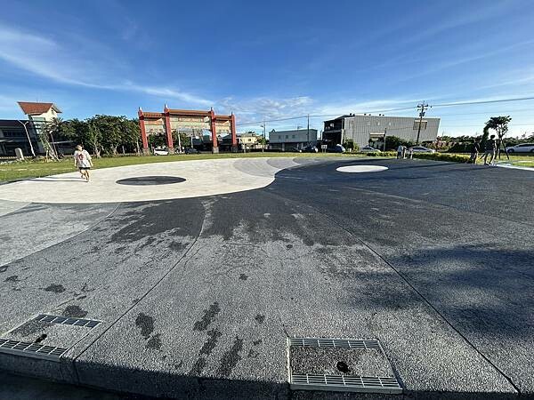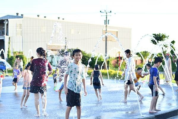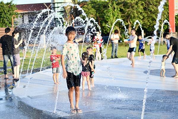 可以戲水的部份是太極造型的噴水池,但它放水時間目前只有三個時段:16:00/17:00/18:00,每次噴水約15~20分鐘左右,我們來時等六點那一場,不管大人小孩都在五點五十幾分就在噴水池stand by了!但並沒有在六點準時噴水耶~不過水一噴出來大家都玩瘋了!