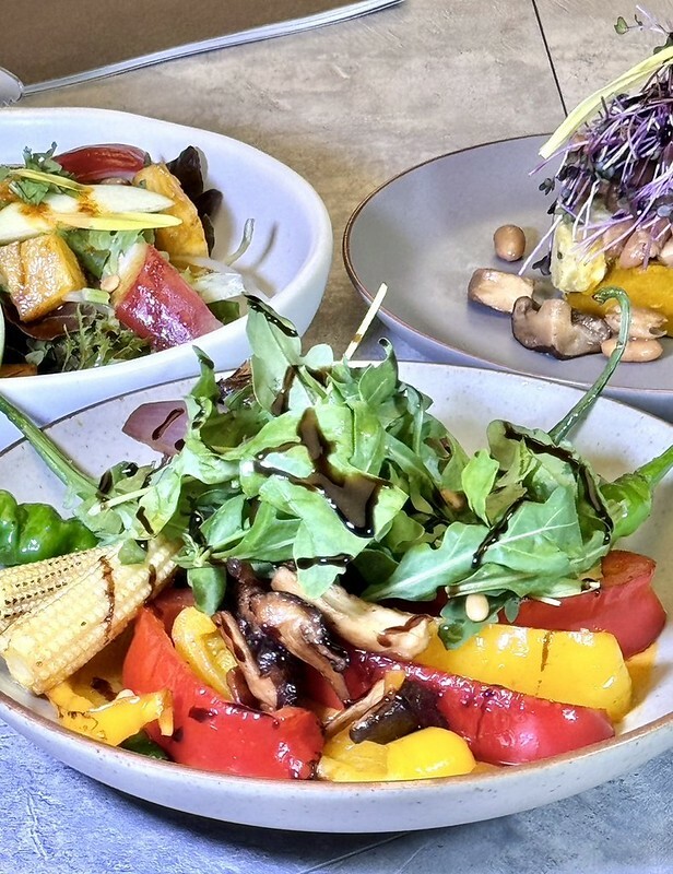接下來是我相對比較喜歡的「娘惹果島沙拉」,巧妙的運用參巴醬、果島醬、娘惹醬三種不同風格的南洋風味沙拉醬汁,多樣化的水果、堅果、地瓜,風味十足卻又有那麼點養生健康的蔬食風。