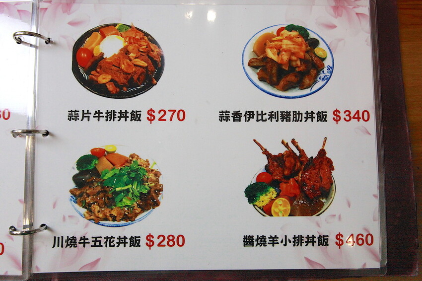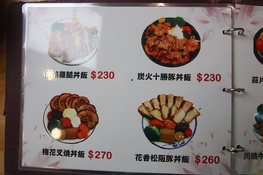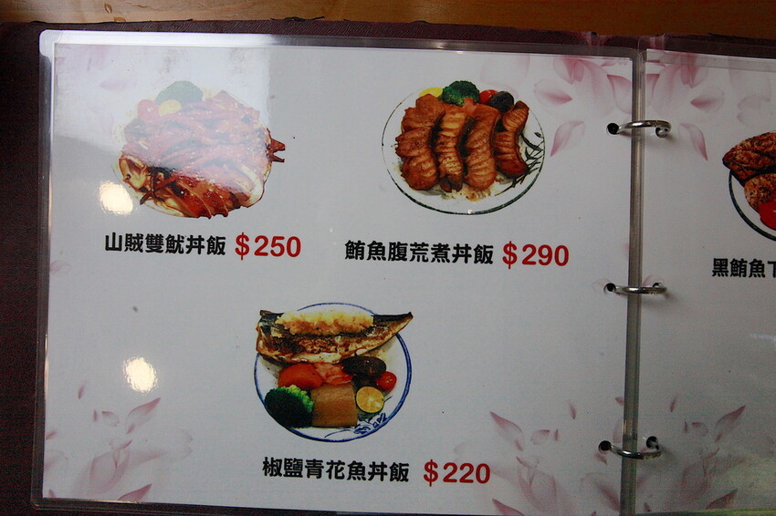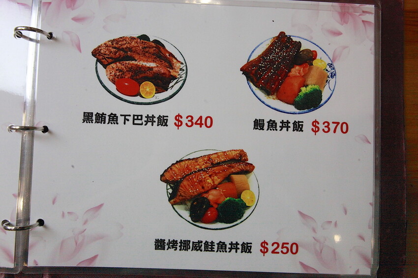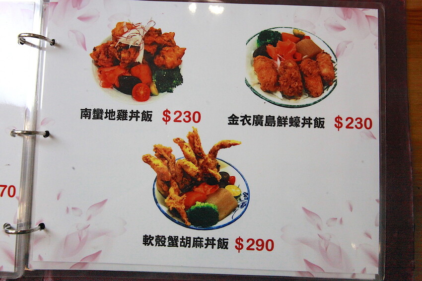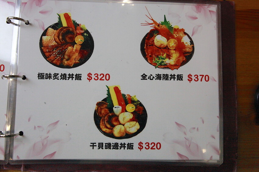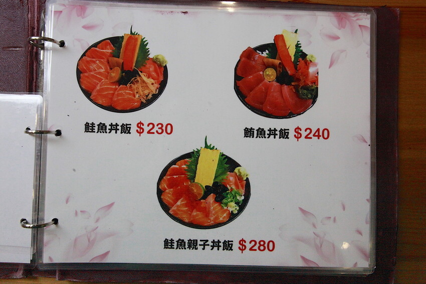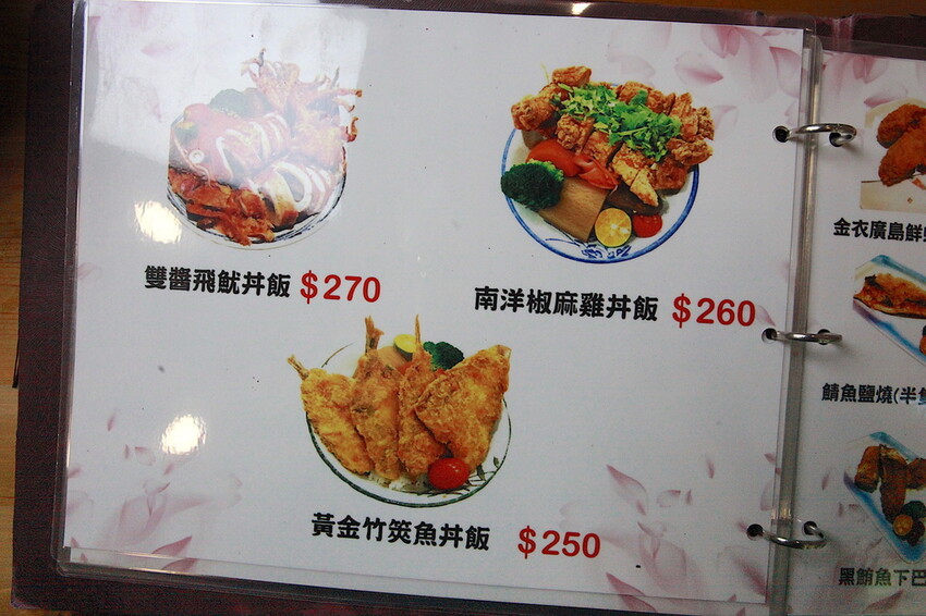 厚厚一本菜單有附照片和定價供參考,小過本身會有選擇障礙得困擾,沒關係直接請服務員推薦,或者菜單上有註明推薦字眼,這樣做就不會有不知所措困擾,點丼飯+110元可升級套餐,套餐有附上沙拉、蒸蛋及小菜等。