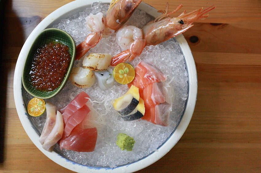 這盤生魚片底部鋪滿啐冰來保鮮,裡面有天使紅蝦、鮭魚、鮪魚、海鱺、鯡魚、章魚、干貝、鮭魚卵…等等,其中天使紅蝦脫殼處過很Q彈好吃
