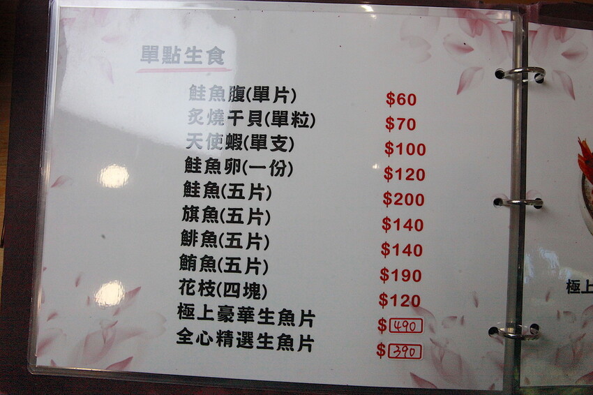 這張是店家點菜單供自行畫選,菜單主要分類有生食(醋飯)類、炙燒半生熟(醋飯)類、海鮮(熟食)類、烤物(熟食)類、炸物(熟食)類、麵食類、單點生食類及單點熟食類等。