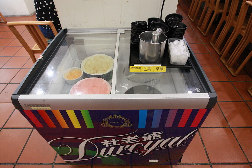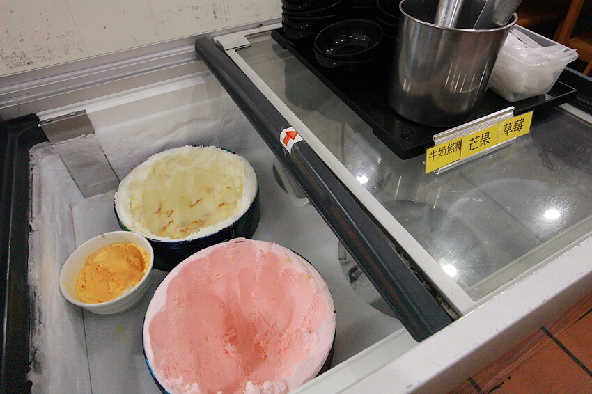 冰凍櫃裡面有牛奶焦糖、芒果及草莓三種口味供選擇。