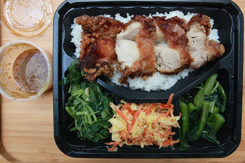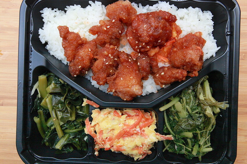 這便當使用品質較好的餐盒來裝盛,便當有三樣配菜是由店家調配。