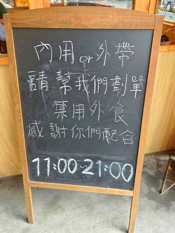 另外還有這個小黑板,除了寫明營業時間,還提醒顧客禁帶外食,不論內用外帶都請先畫單