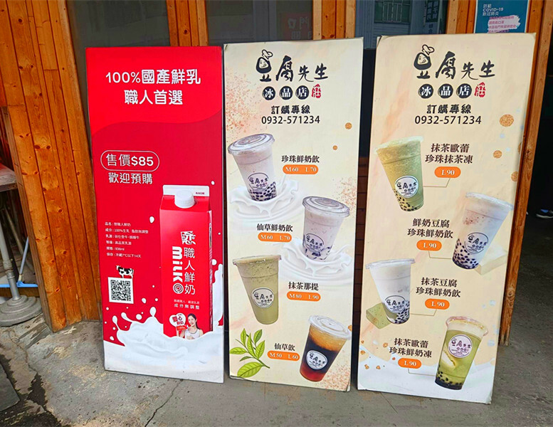 門口就放了好幾個立牌,告訴大家它們也有賣各種不同的手搖飲和牛奶,包括珍珠抹茶凍、鮮奶飲和仙草飲等,價格約$50~90