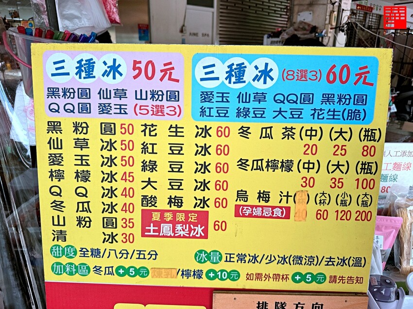 這款三種冰是阿坤黑粉圓的招牌,加了仙草、愛玉、粉圓這三種配料。