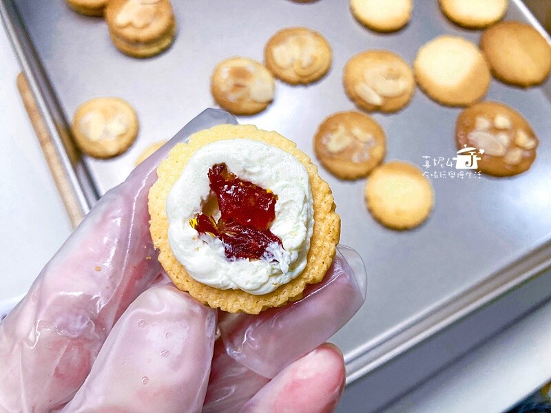 3)另一半餅乾,擠一圈奶油餡,中間放牛蕃茄果乾碎,蓋上有糖霜的餅乾後輕輕壓合