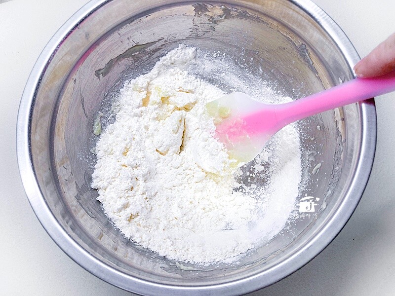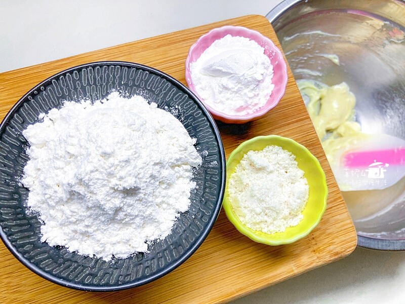 2.篩入低筋麵粉,玉米粉,杏仁粉,混拌到看不見粉末的團狀