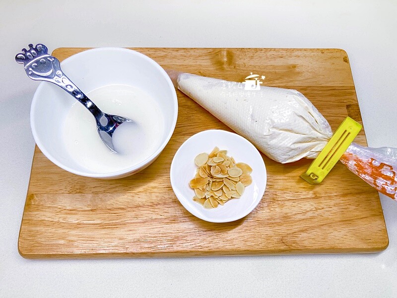 2)一半數量的餅乾,用抹刀或湯匙底部把糖霜塗在表面,再放幾片烤過的杏仁片,進烤箱170度C烤1分鐘