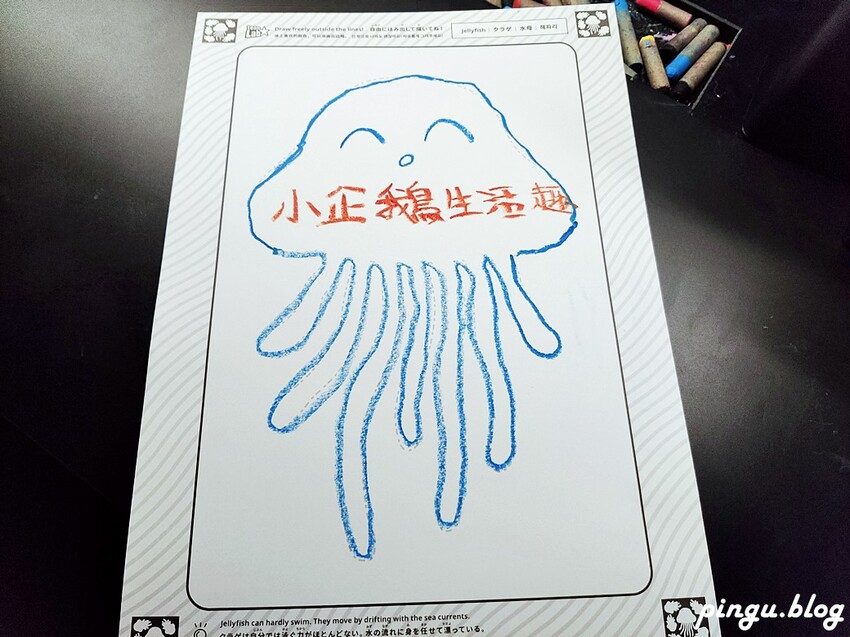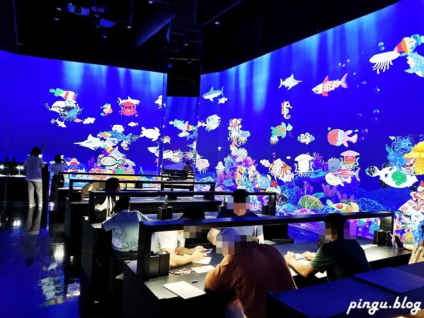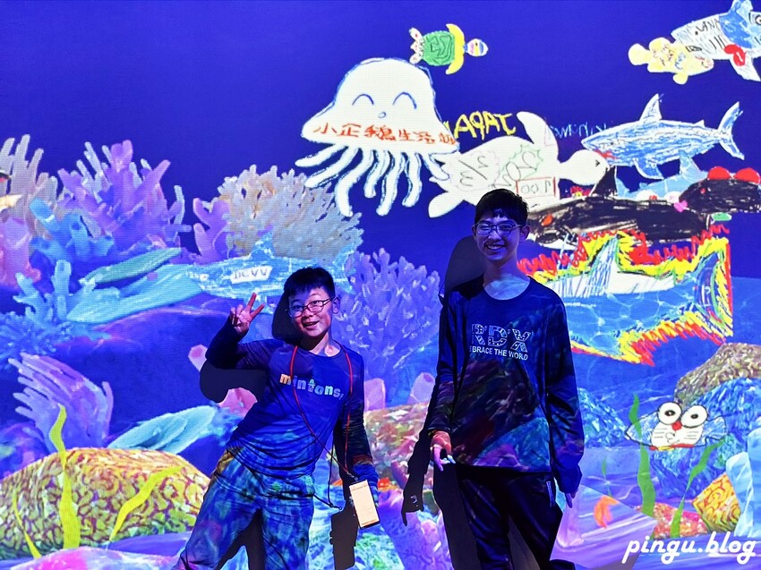 這裡彩繪的圖案可以掃描QR CODE到出口處做成獨一無二的徽章唷~~許多海底生物在水族箱內游來游去~趕緊來找找自己彩繪的海底生物出現在哪唷~