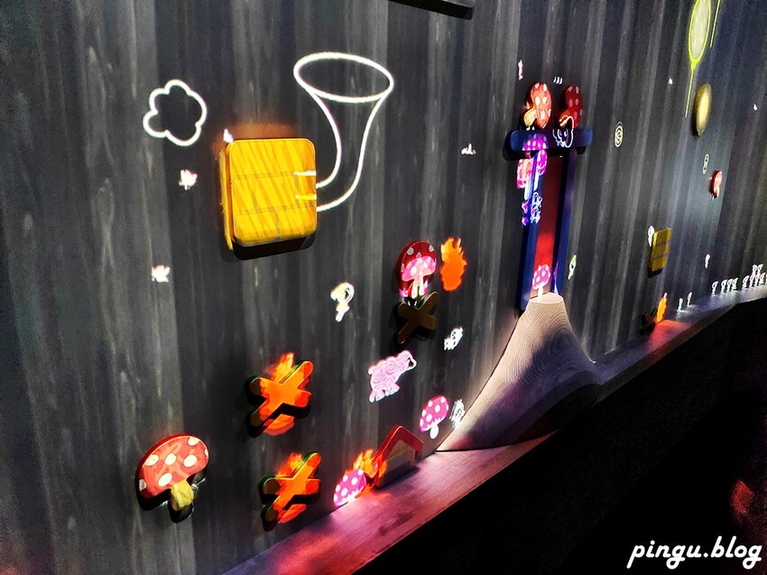 牆上的蘑菇、羊小屋、冰柱等各式各樣的圖章可以任意移動,移動後就會有不同的光影效果出現,碰撞圖章發出的音樂還會根據牆壁的高度,產生音階上的高低變化,隨著小人兒小人兒會在牆壁裡來回奔跑非常有趣~~小朋友們肯定很喜歡~~