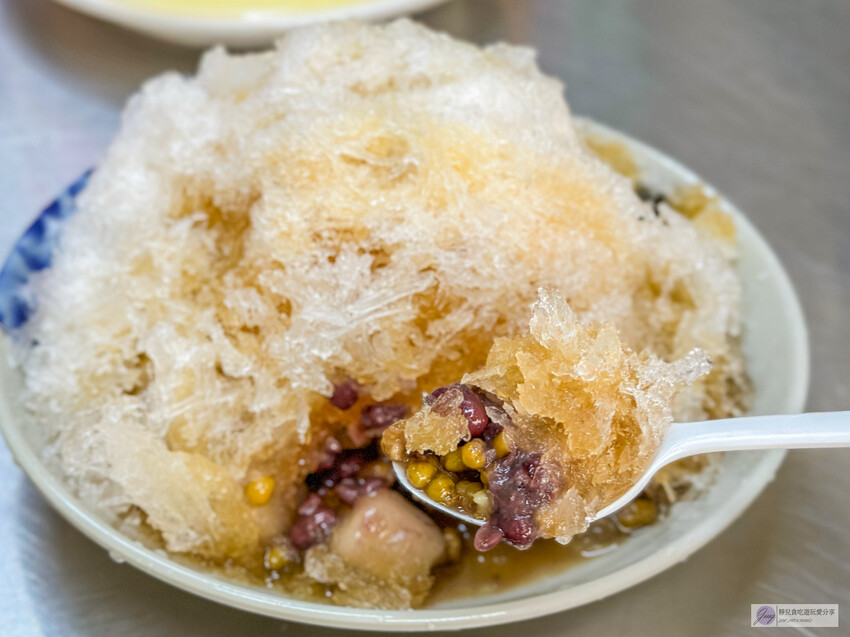 刨冰吃起來就中規中矩,四種口味有芋圓、綠豆、紅豆、仙草,淋上了黑糖水,不過糖水甜度很剛好,不會過甜,不想吃有料的,可以點黑糖清冰只要30元,超級便宜唷!!