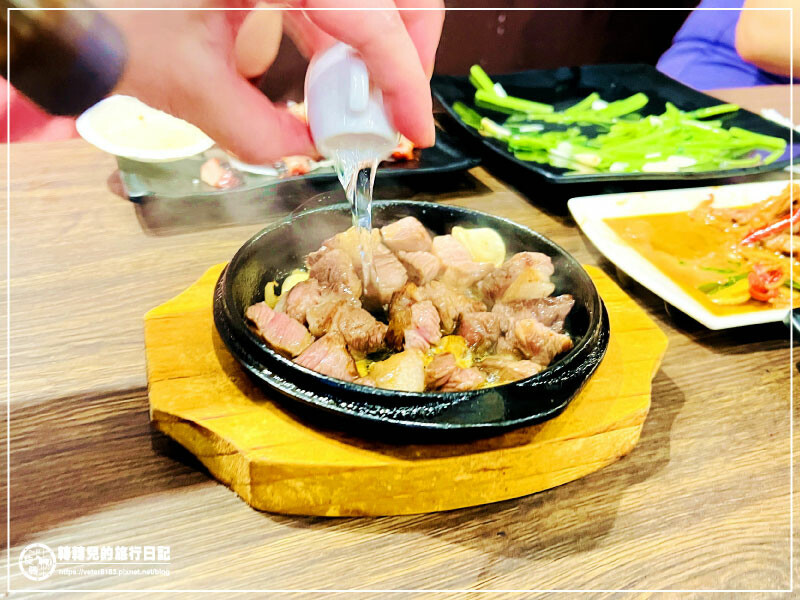 這裡的骰子牛不確定是不是用牛肩胛部位,但肥瘦相間,口感豐富有嚼勁。上桌時會加一小杯白酒,店員現場點火,火燒盡後,奶油也融化了。每一口都有淡淡的奶香味,配上蒜片,口感豐富又有層次,這道菜也是我每次來必點的。