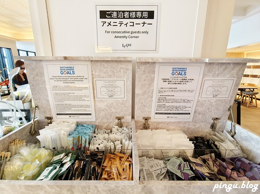 大廳的柱子旁有盥洗用品及保養品可以索取,備品超齊全,可依住宿天數索取所需用品~~