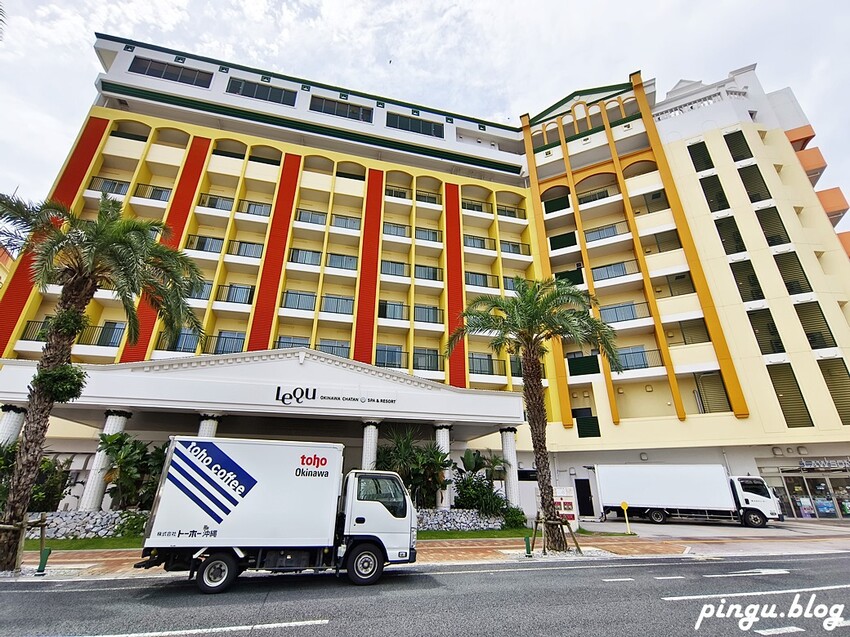 雷克沖繩北谷溫泉度假村挺大間的,不愧是渡假飯店,一旁有免費停車場,1樓就有LAWSON便利商店,走出門口就是美國村商店大街,走到海灘也僅要5分鐘,交通相當方便~