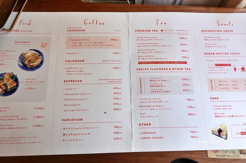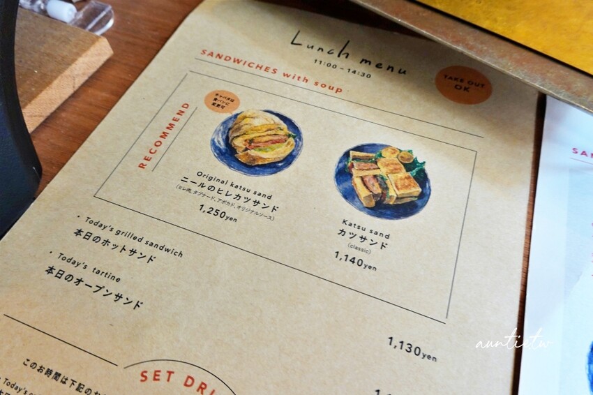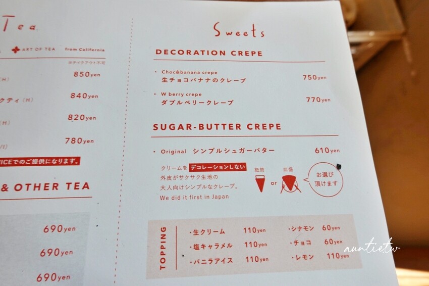 店內的鹹食餐點以三明治等輕食為主,甜點還有可麗餅、蛋糕等,飲料有茶、咖啡以及果汁,選擇還算豐富。