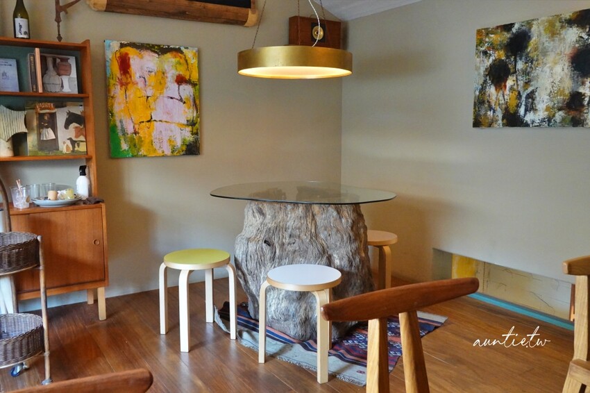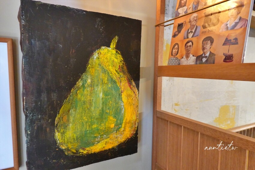 Logo是一個梨子,店內掛了很多畫作,整體是木質的裝潢,燈飾很特別,感覺起來是一間很溫馨的咖啡廳。