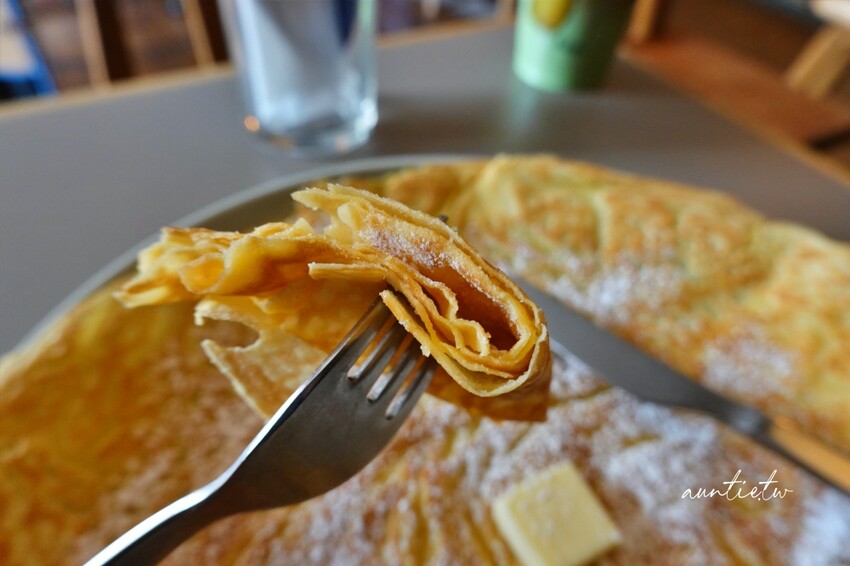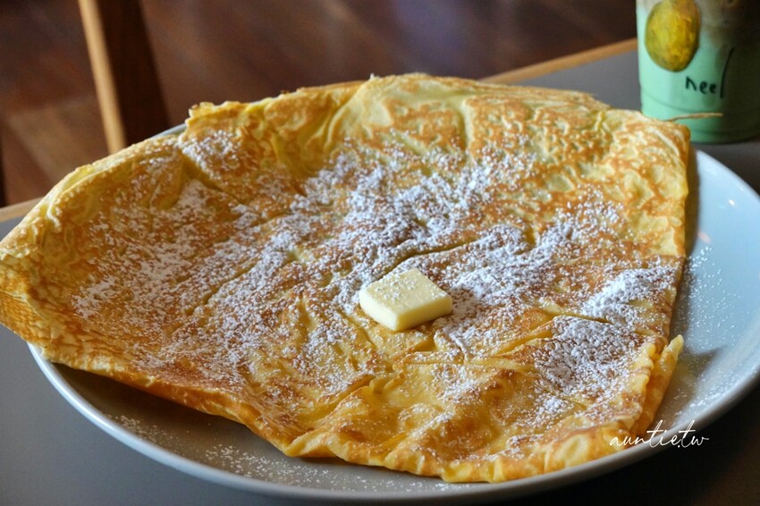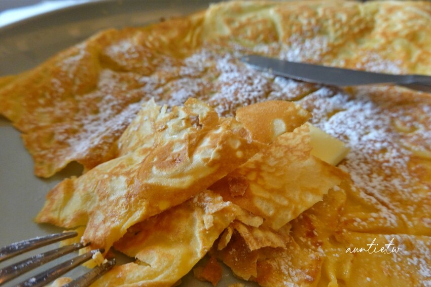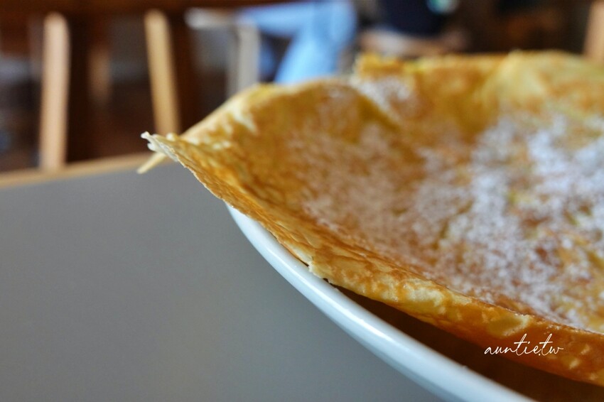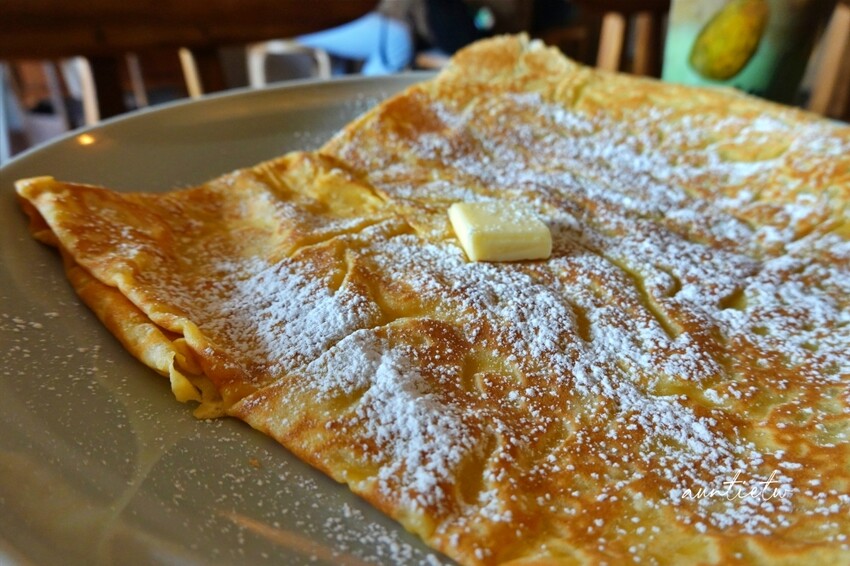 加了一塊奶油,撒上一點糖粉,簡簡單單的原味奶油可麗餅,我真的是小看它了,原本以為是像法國可麗餅一樣軟趴趴的口感,沒想到是外酥內軟,邊邊吃起來是帶著脆脆的口感,捲一捲一口吃,很像剛烤好的蛋捲,偏軟微酥的口感,餅皮的香氣很濃郁,不會太甜膩,看起來很一般,但是吃起來非常好吃!!