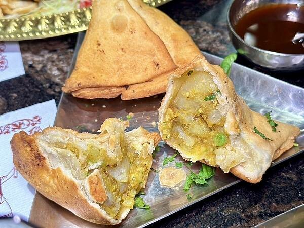 其酥脆的外皮與濃郁的咖哩內餡、馬鈴薯、豌豆,
