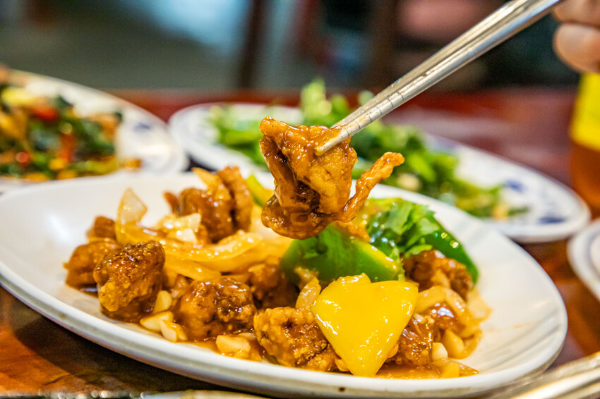 糖醋雞丁,酸甜的芡汁加上先炸後炒的軟嫩雞丁跟青黃甜椒大火炒,雞丁外酥內嫩,酸甜開胃,而且沒有骨頭,小孩子應該會很喜歡