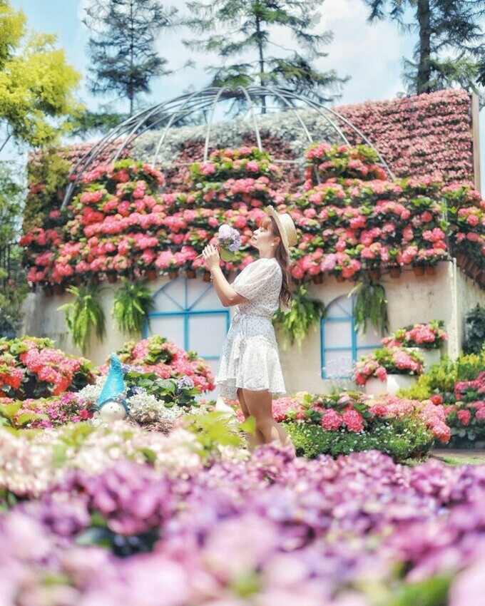 花露農場裡面有一片綠油油的大草地,在精油城堡旁邊有一棟白色清新的花屋,一樣被美麗的花堆裝飾著,屋頂、屋前滿滿的繽紛花卉佈置,花屋內外都佈置非常精緻美麗,旁邊也有一大片繡球花海,也是適合拍照打卡的景點之一!