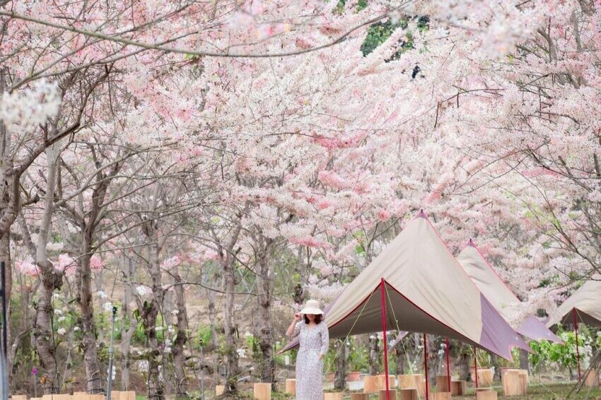 美濃露營聖地蝶舞澗休閒農場,主打懶人豪華露營,不需要準備任何露營設備就可入住,很推薦想要輕裝露營的人。蝶舞澗帳篷外形像是蒙古包,空間充足還備有冷氣、插座、日用品一應俱全,夏天不至於太過悶熱,而且住宿還可以免費借用桌遊、運動休閒器具等,園區中有許多花草樹木,每到3、4月更是花旗木的花期,綻放的粉紅花朵布滿整個園區,就像鋪上了一層粉色天棚,坐在底下露營真的超浪漫。