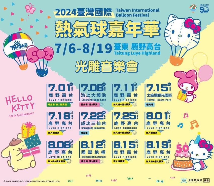 今(2024)年再創新,聯名三麗鷗知名家族角色「HELLO KITTY、布丁狗、美樂蒂、酷企鵝及大耳狗喜拿」加入無人機展演陣容,真的是很華麗的陣容!這篇推薦了私房最佳賞球座位,還有鹿野一日遊推薦景點,台東一切都好,就只缺你了!快來玩❤️