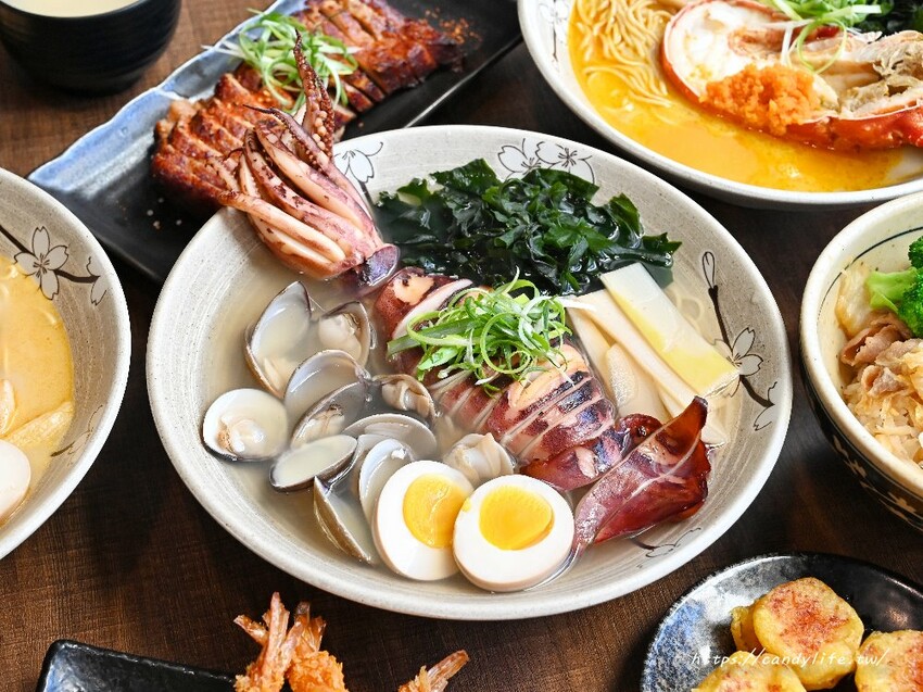 不只剛剛的青龍蝦拉麵,兆曜拉麵丼飯這碗蒲燒魷魚拉麵也超浮誇,料多到已經看不見底下的拉麵了!一整隻的魷魚,搭配筍片、糖心蛋及海帶,湯頭糖糖搭配的是蛤蜊湯底,裡頭還會多了八顆蛤蜊