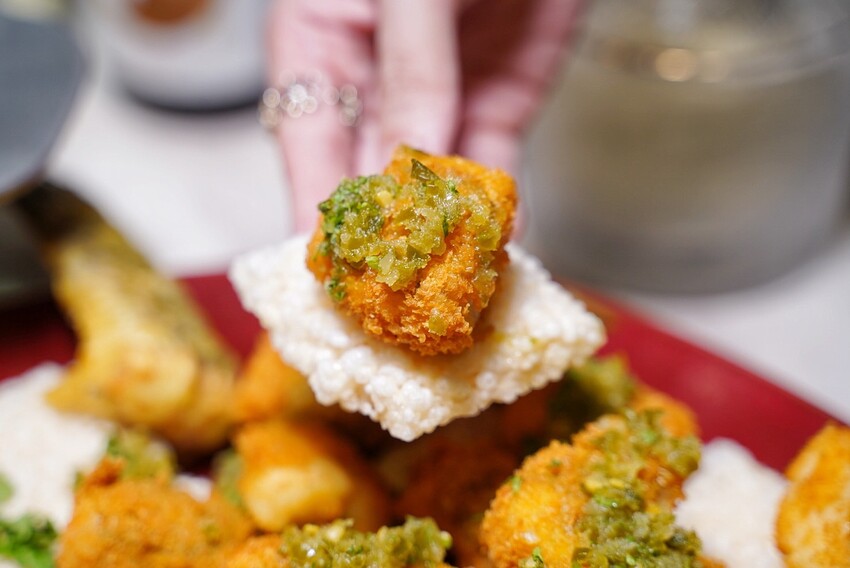 「酥炸青醬鱸魚」炸至金黃色澤的鱸魚塊,外皮酥脆裡頭鮮嫩細緻,淋上香辣的火山排骨醬料,再搭配酥脆米餅,好吃到讓人回味無窮!重點是無骨魚肉,可以放心大口吃。