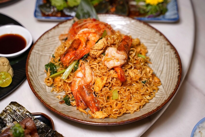 「泰式炒媽媽麵」裡頭有蝦子、炒蛋等等佐料,一旁還有泰式漬洋蔥可以搭配享用,鹹香涮嘴的滋味,誰能不愛?