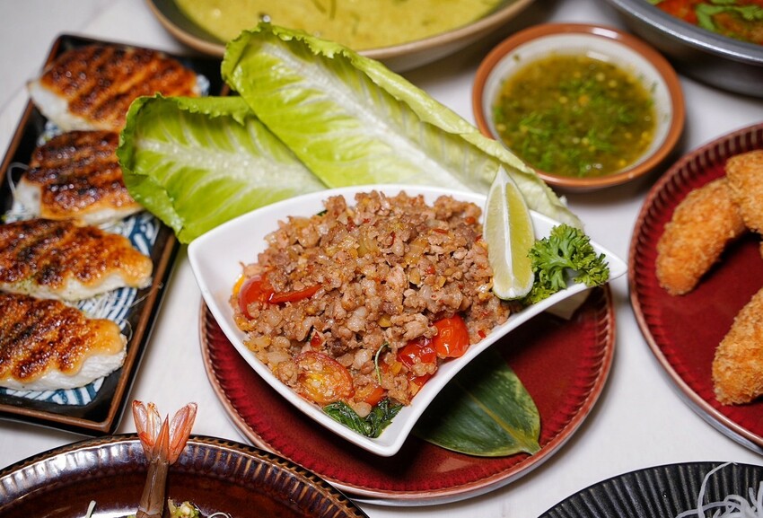 「泰式打拋豬」跟泰國街邊吃到的一樣香辣過癮,豬絞肉炒得乾爽又入味,打拋葉更增添清爽滋味,搭配美生菜一口塞超級滿足。