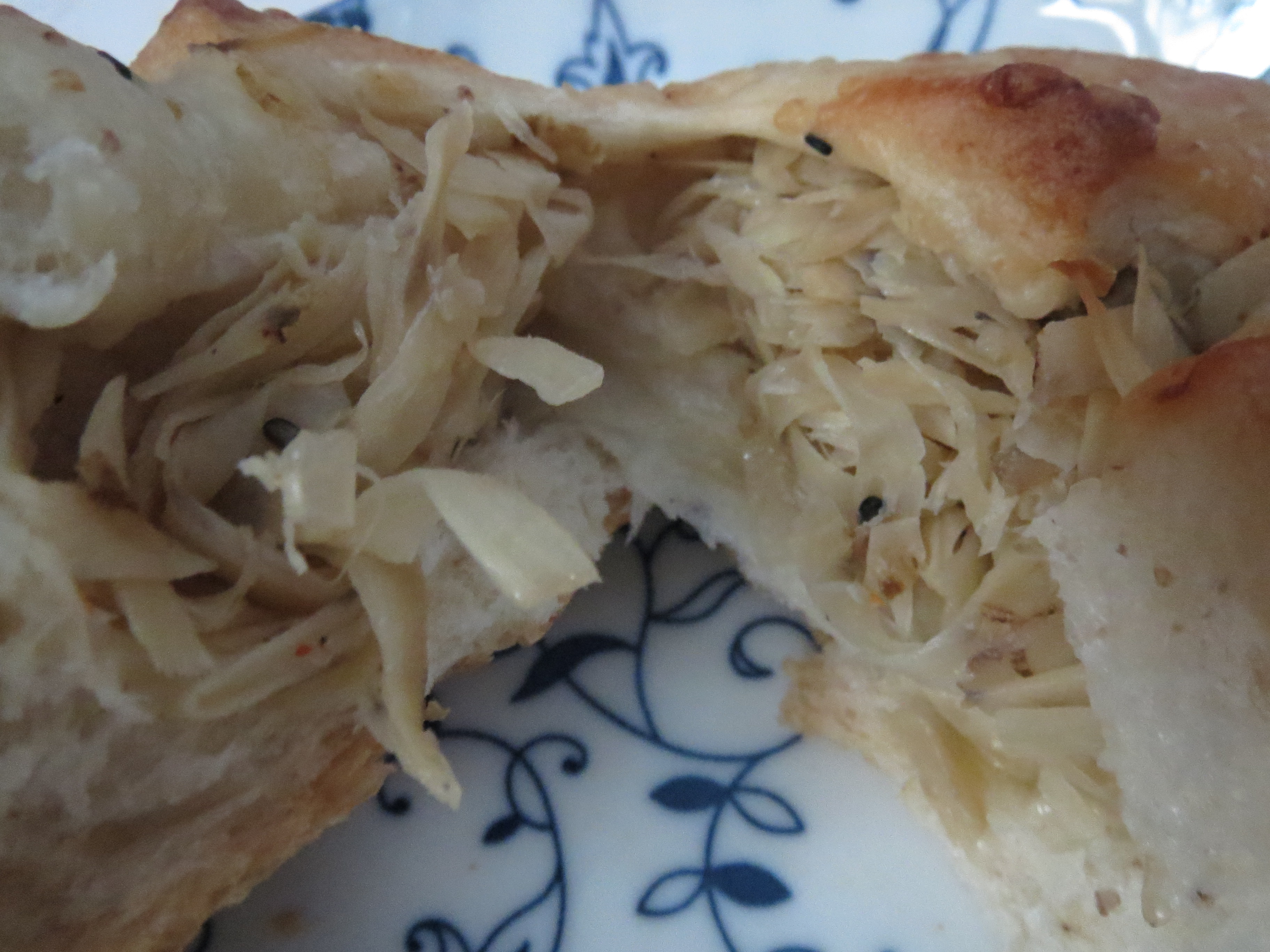 其實我並沒有很喜歡牛蒡,只是很好奇牛蒡跟麵包搭配起來的口感,事實證明我還是無法跟這種食材有所共鳴。不只是外表跟筍絲有相像之處,它甜甜鹹鹹的滋味也讓我不自覺地聯想到竹筍也可以用某種方式調理,讓它出現類似的味道