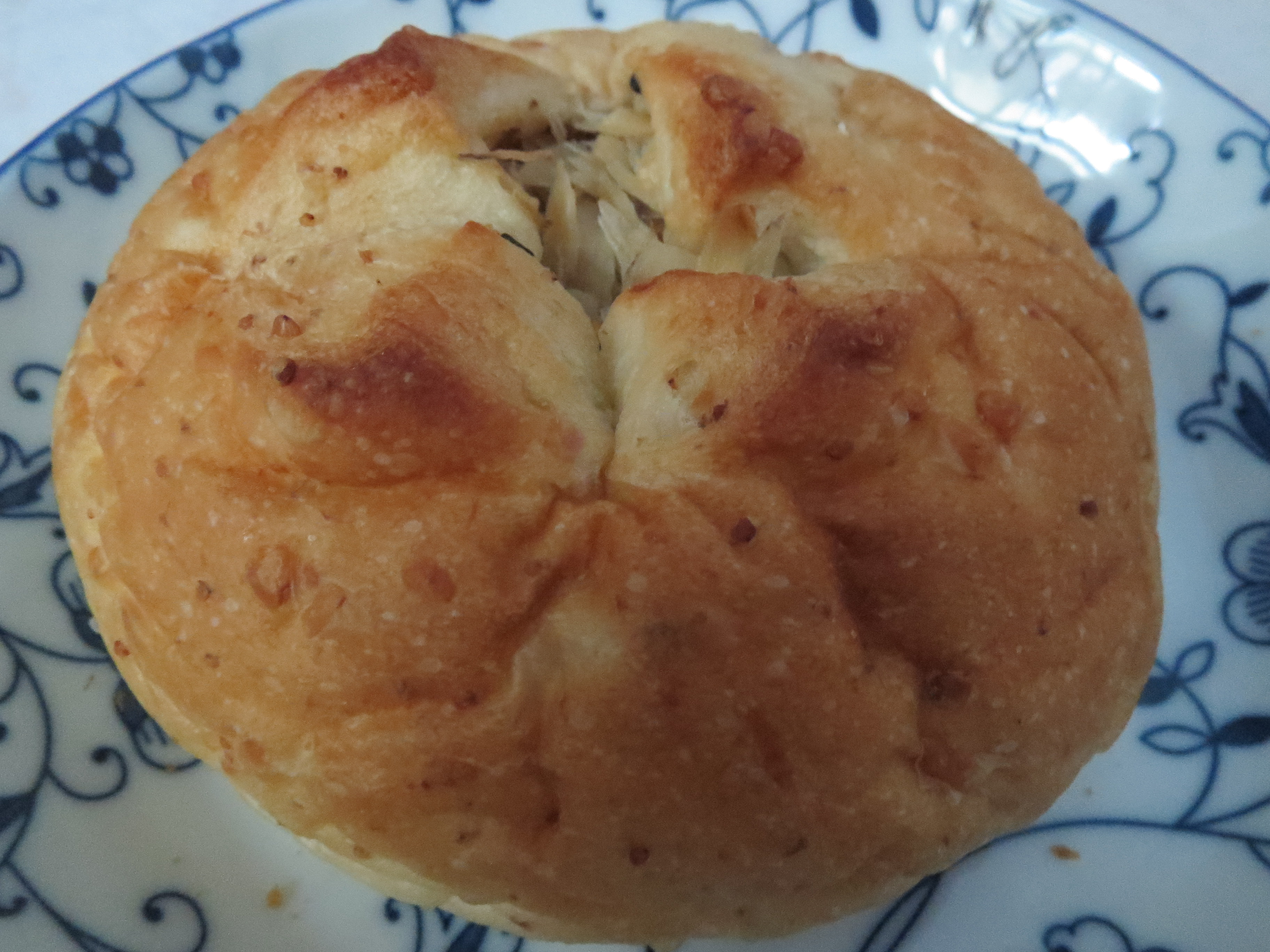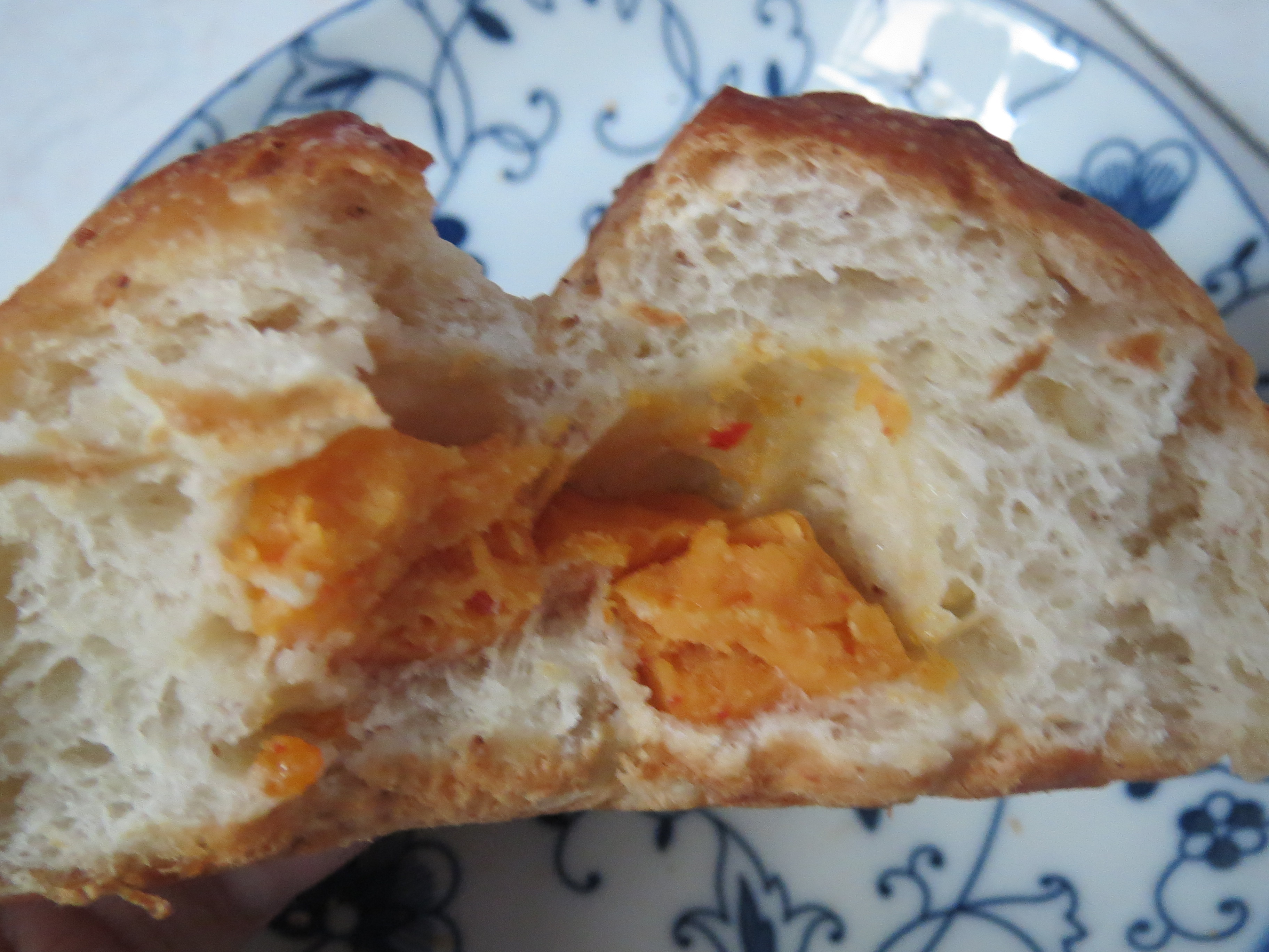 原本我還以為泡菜乳酪的泡菜就是韓式料理中會見到的泡菜,實際品嚐才知道不是這麼一回事。它的內餡是用添加了泡菜成分的乳酪製成的,味道近似於超商的黃金起司麵包的起司塊。不同的地方是它多了一些辣味,不過還在我的接受範圍內;顏色的部分也呈現泡菜的鮮紅色。