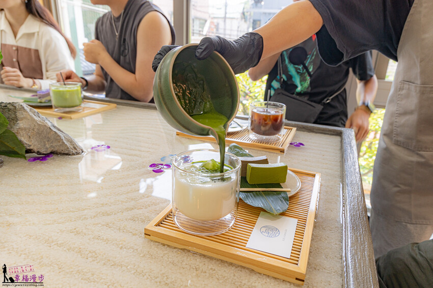 抹茶跟抹茶羊羹、焙茶羊羹,端上桌時杯子裡只有牛奶,抹茶是服務員手沖後到桌邊加入牛奶裡,頓時整個抹茶香氣撲鼻而來,抹茶茶韻濃厚很順口。