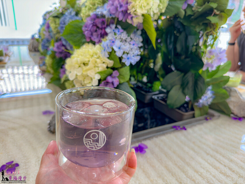 紫陽花氣泡飲,淡紫色的飲品真的很有紫陽花的特色,加上冰塊真的好消暑喔!