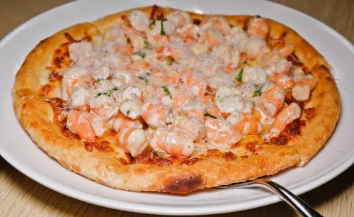 ▼超澎派的海鮮總匯披薩,會依照季節加入當季的食材,這次吃到蟹肉棒、蝦仁和花枝,餅皮薄脆不會很太厚難咬,趁熱拉起還會有邪惡起司牽絲!