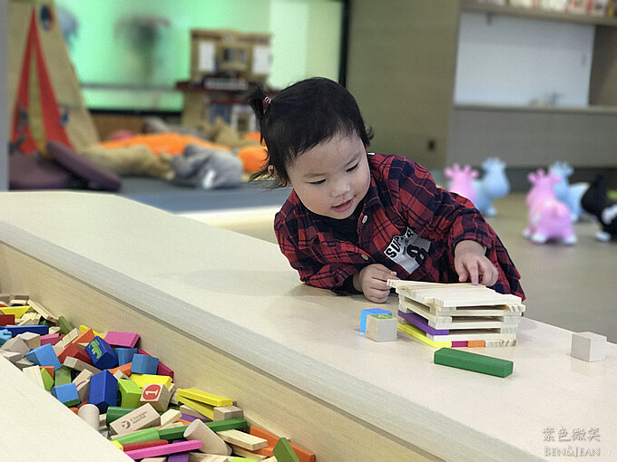 中間一大積木長桌非常吸引人,小榛果玩了好久也不厭倦