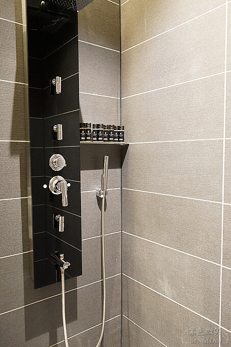 浴室是黑白色調為主,沉穩大方,乾溼分離的設計,也有浴缸可以泡澡哦