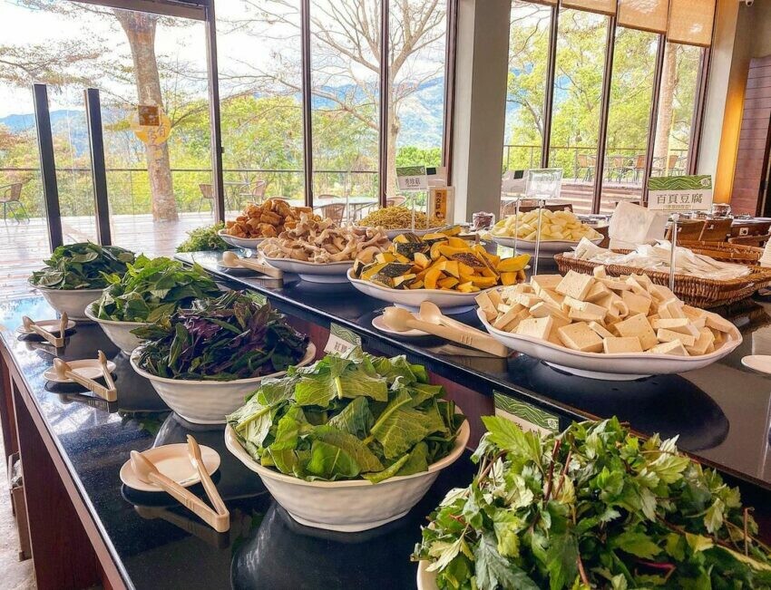 台東原生應用植物園還有很特別的「汆燙鍋」,最大賣點就是使用了園區內的現採的有機蔬菜,像是甜菠菜、綠地瓜葉等,也能看到許多種有機藥草,比如川七菜、土肉桂菜、白馬齒莧等,都是外面火鍋很少見的食材。