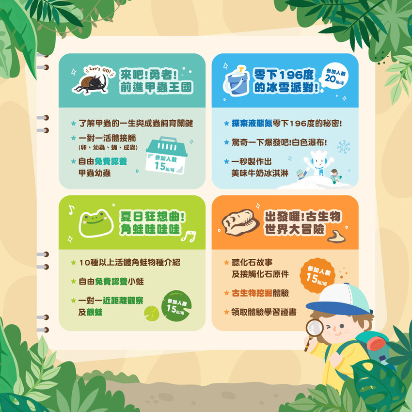 《來吧!勇者!前進甲蟲王國》《零下196度的冰雪派對!》《夏日狂想曲!角蛙哇哇哇》和《出發囉!古生物世界大冒險》,