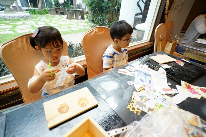 等候 check in 時,一旁還提供的手工餅乾和咖啡、茶飲,坐在小朋友專屬的桌椅享用~雙果好開心!!