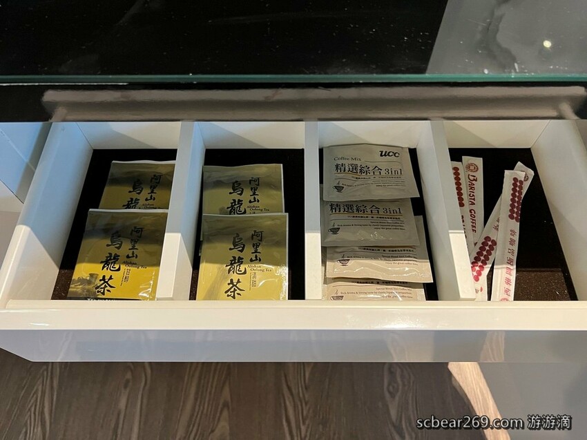 上下兩層的抽屜拉開,分別有茶包、三合一咖啡和馬克杯