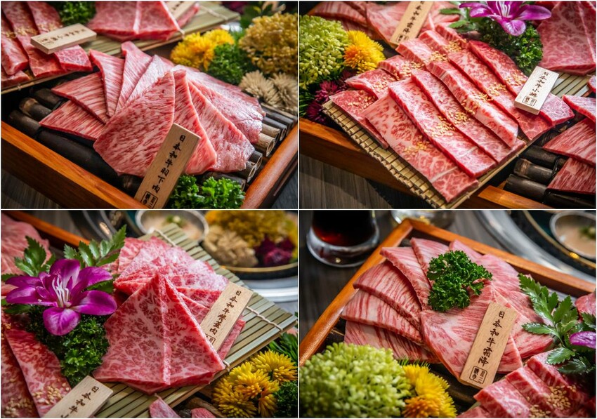 極上和牛三人套餐的主餐都是使用日本A5和牛!而且一次給四種部位:霜降,羽下肉、牛臀蓋肉、牛小排,份量也是超驚人的,日本A5和牛全部都是厚切處理,擺盤也是非常漂亮,對比他的價位整套下來,如果在台北應該是7~8000元跑不掉