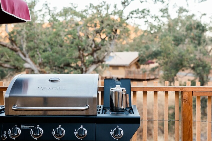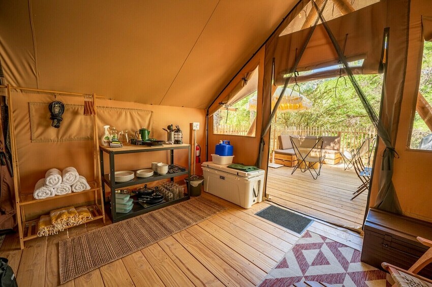 看似樸質的帳篷屋,裡面不但有乾濕分離的衛浴設備,還備有全套的鍋子、碗盤和杯子,冷藏冰櫃。室內有一套桌椅,戶外有一張舒適的L型沙發,長方形的休閒餐桌,兩張導演椅,BBQ烤爐。