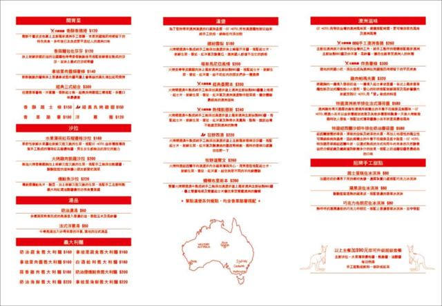 菜單種類很多,有沙拉、義大利麵、漢堡和店家主打的澳洲滋味。